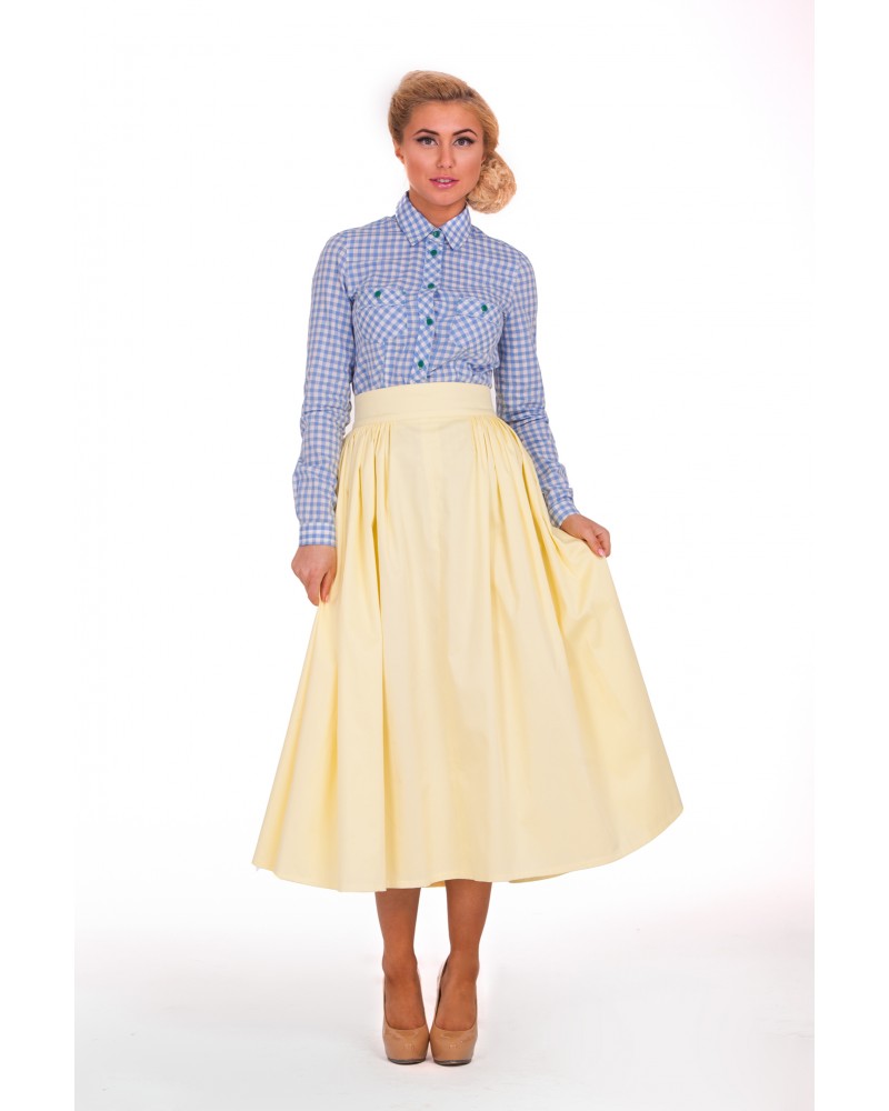 Юбка модели до середины икры сглаживает фигуру, скрывает все недостатки. Легкие складки отлично сочетаются с классической рубашкой.